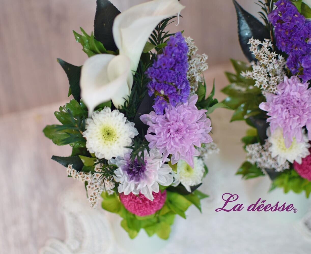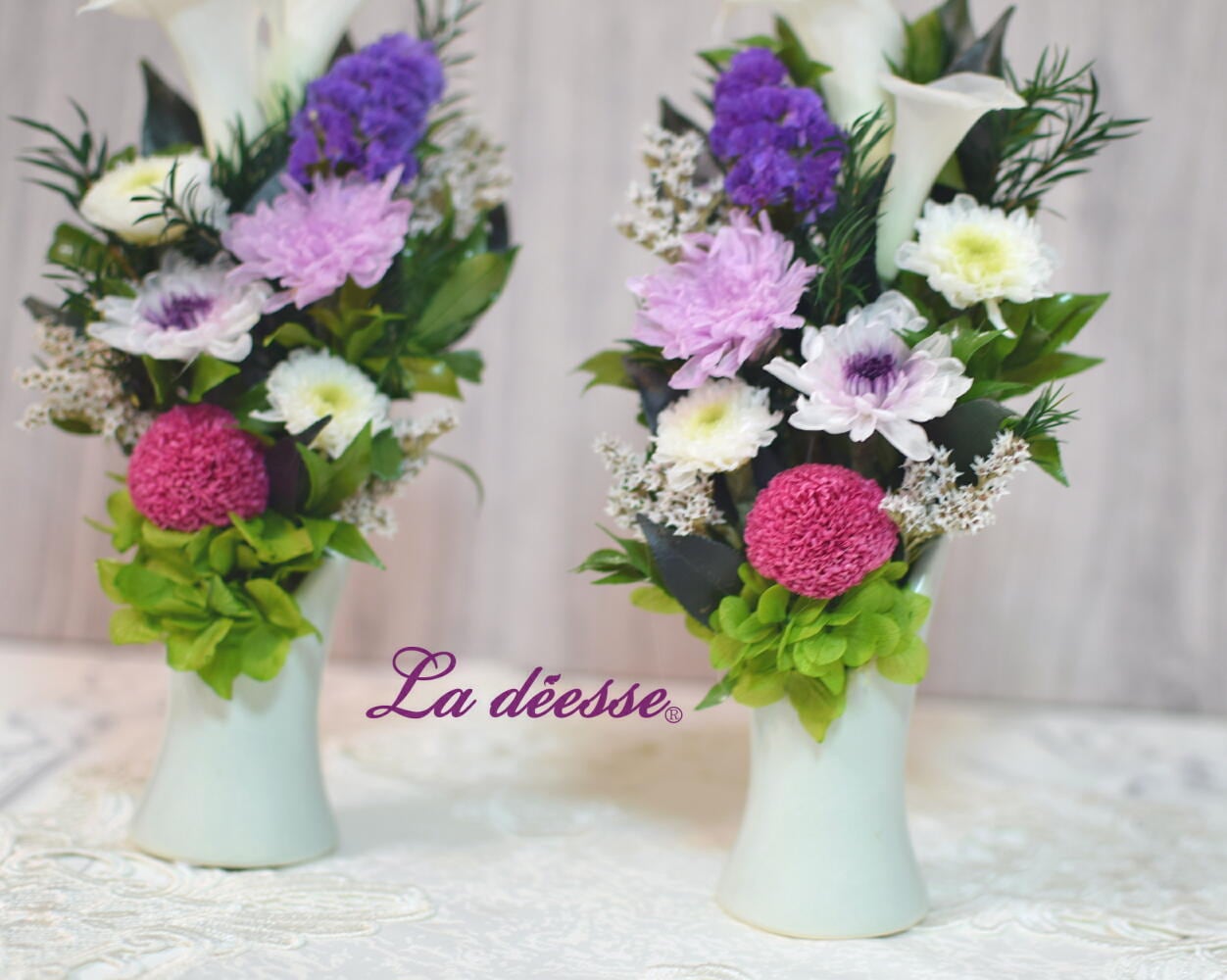 スリムな一対お供仏花プリザーブドフラワ律輝_ 全部天然素材使用