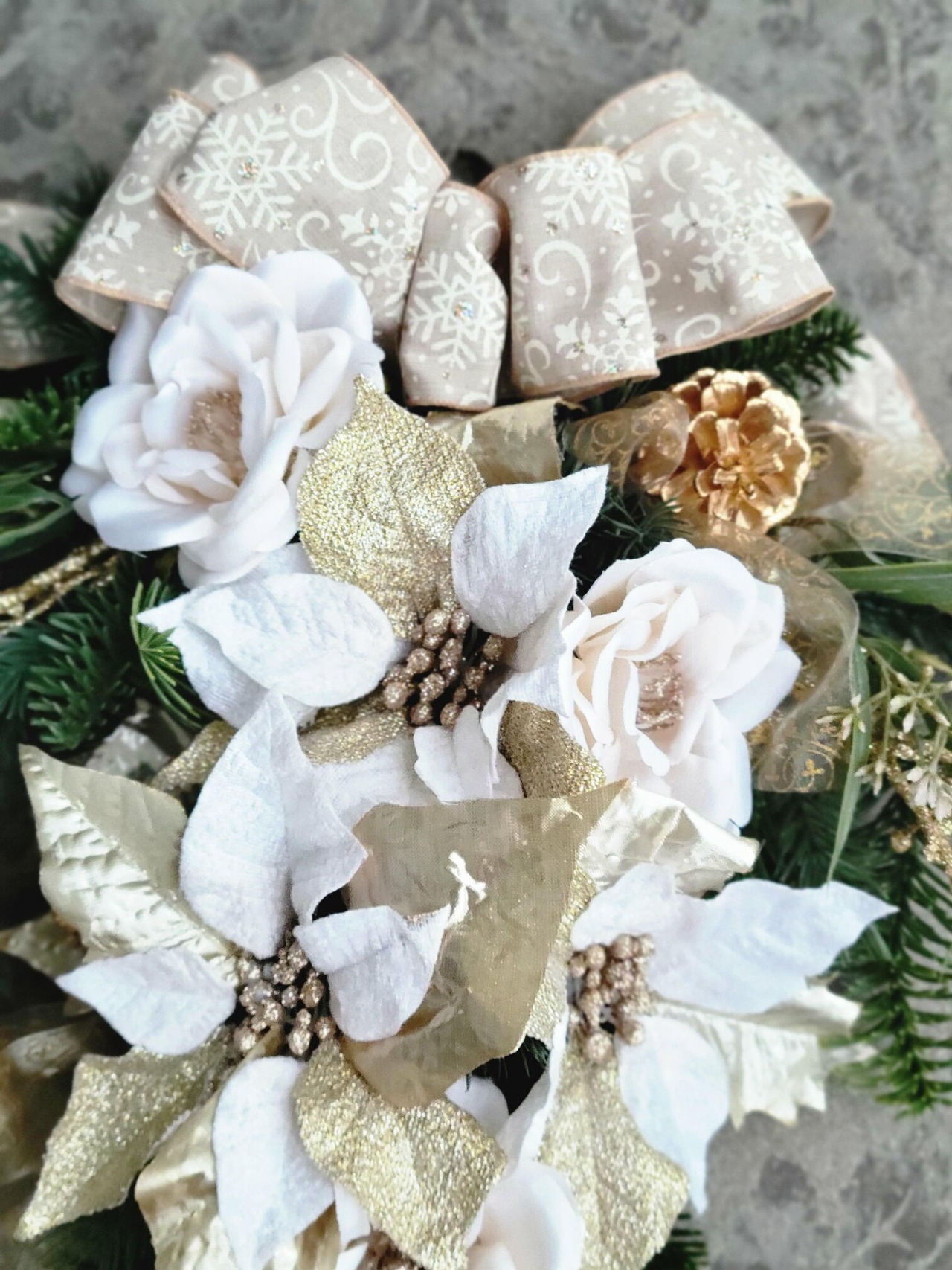 白とゴールドのポインセチアやホワイトローズのお花に、ラメがさり気なくちりばめているリボンをたっぷりとアレンジしました。